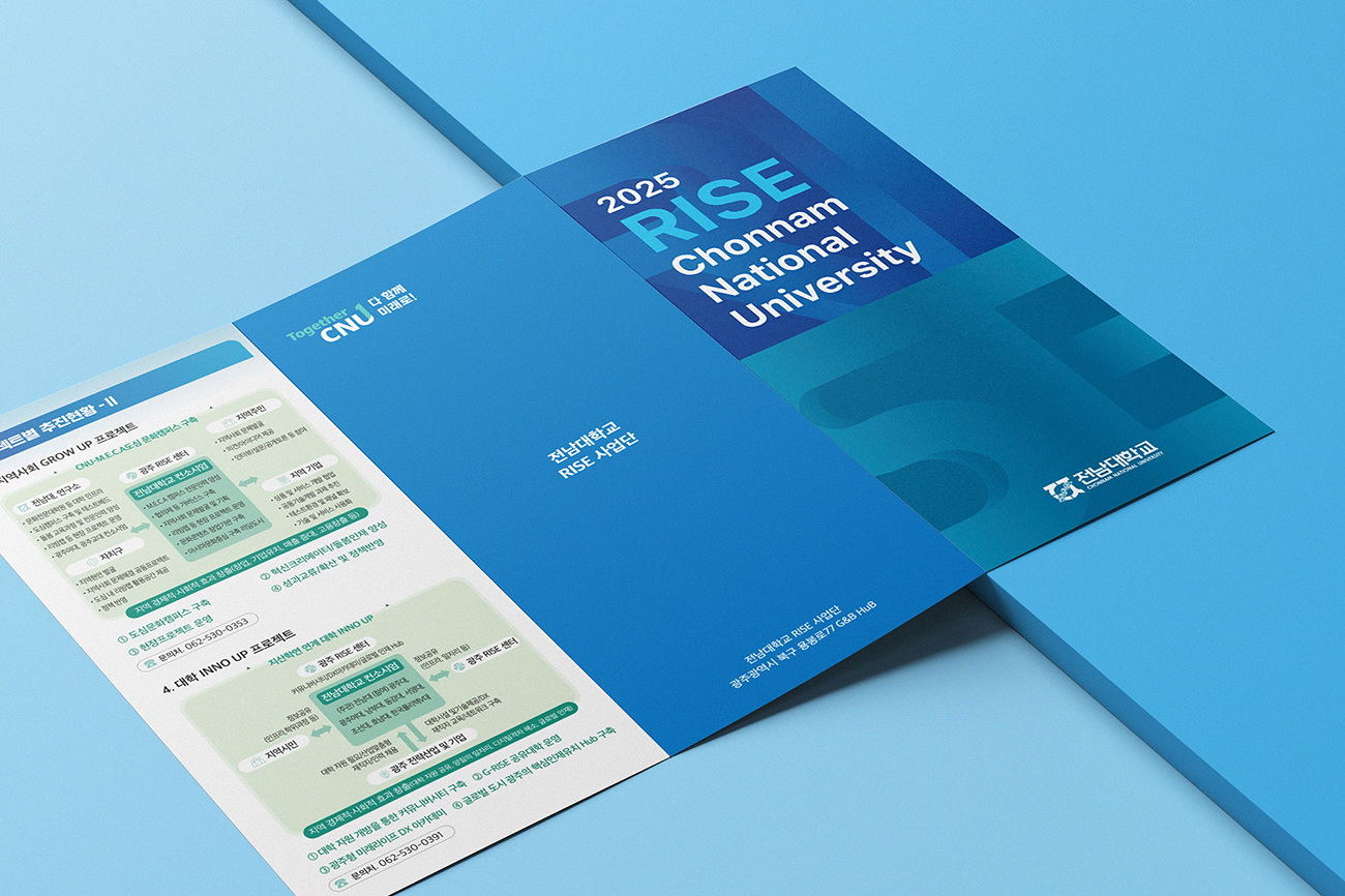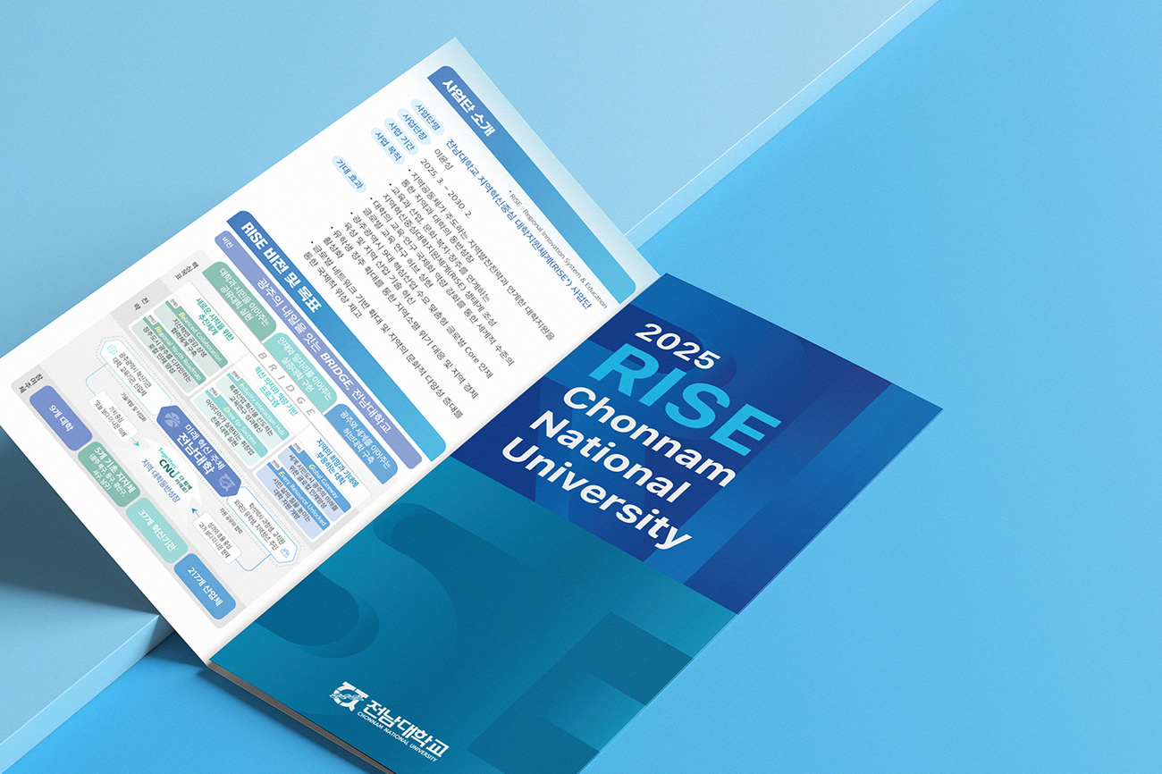 전남대학교 RISE사업단은 대학의 산학협력 창구 일원화, 지적재산권의 효율적 관리, 독립회계의 필요성 등 산학협력 연구활동을 체계적으로 지원하기 위해 설립되었습니다. 디자인줌은 대학과 시민, 인재와 일자리, 광주와 세계의 조화로운 이어짐을 <연결의 미학>이라는 키워드로 재해석하였습니다. 유기적으로 연결되는 타이포그래피는 소통과 공감을 상징합니다.