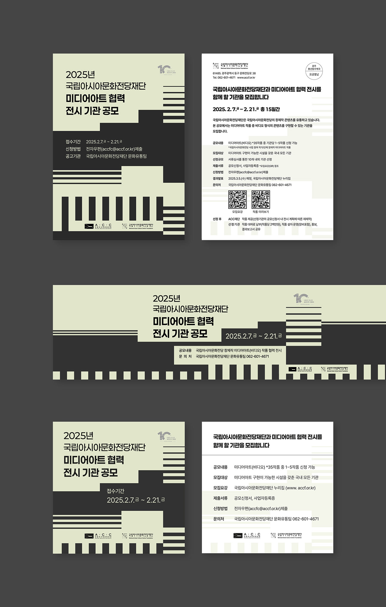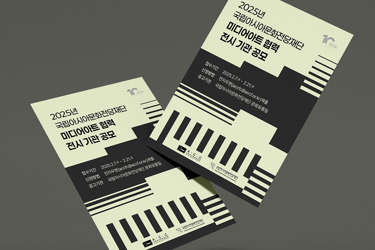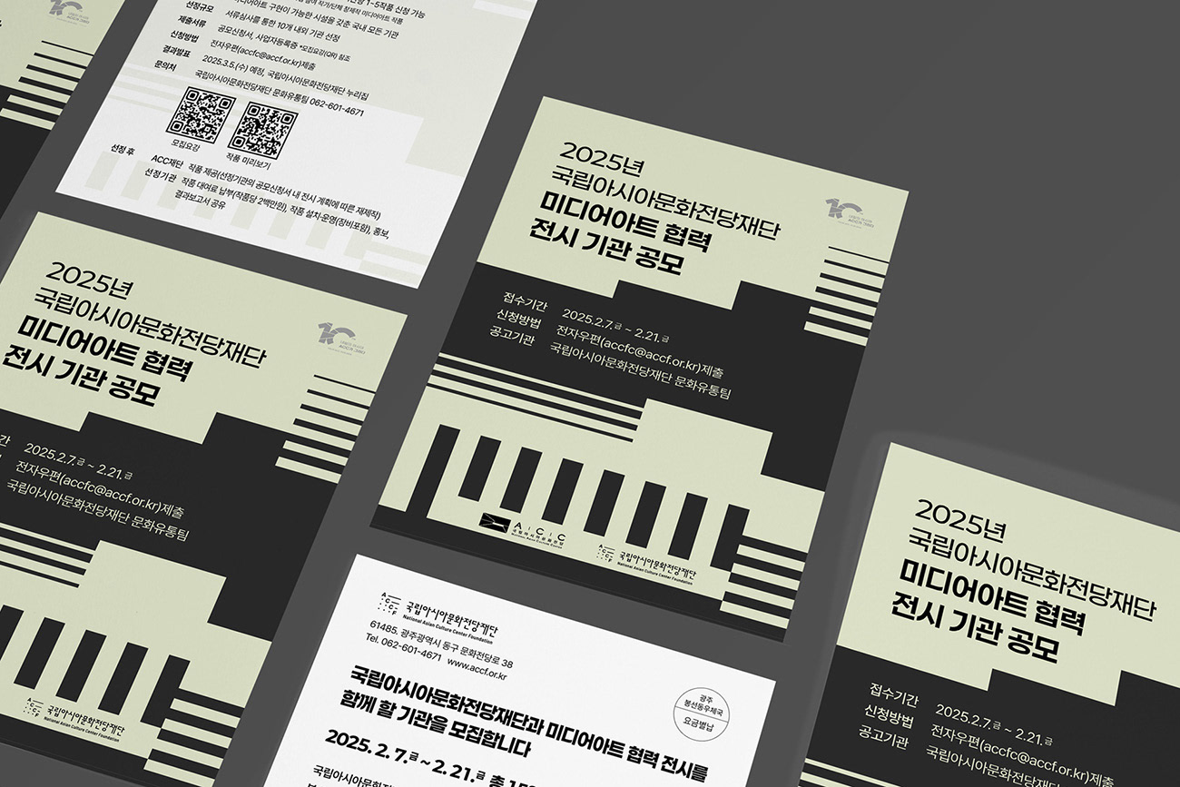 국립아시아문화전당재단(ACCF)은 미디어아트 콘텐츠를 통해 대중과 예술의 접점을 넓히고, 문화유통의 선순환 구조를 구축하는 국가적 문화 거점 기관입니다. 디자인줌은 ACCF가 지향하는 문화적 연결성과 미디어아트의 혁신적 가치의 시각화를 위해, 예술적 상상력이 기술을 통해 구현되는 미디어아트의 특성을 감각적인 배치로 연출하여, 협력 기관 모집을 위한 최적화된 비주얼 아이덴티티를 완성하였습니다.
