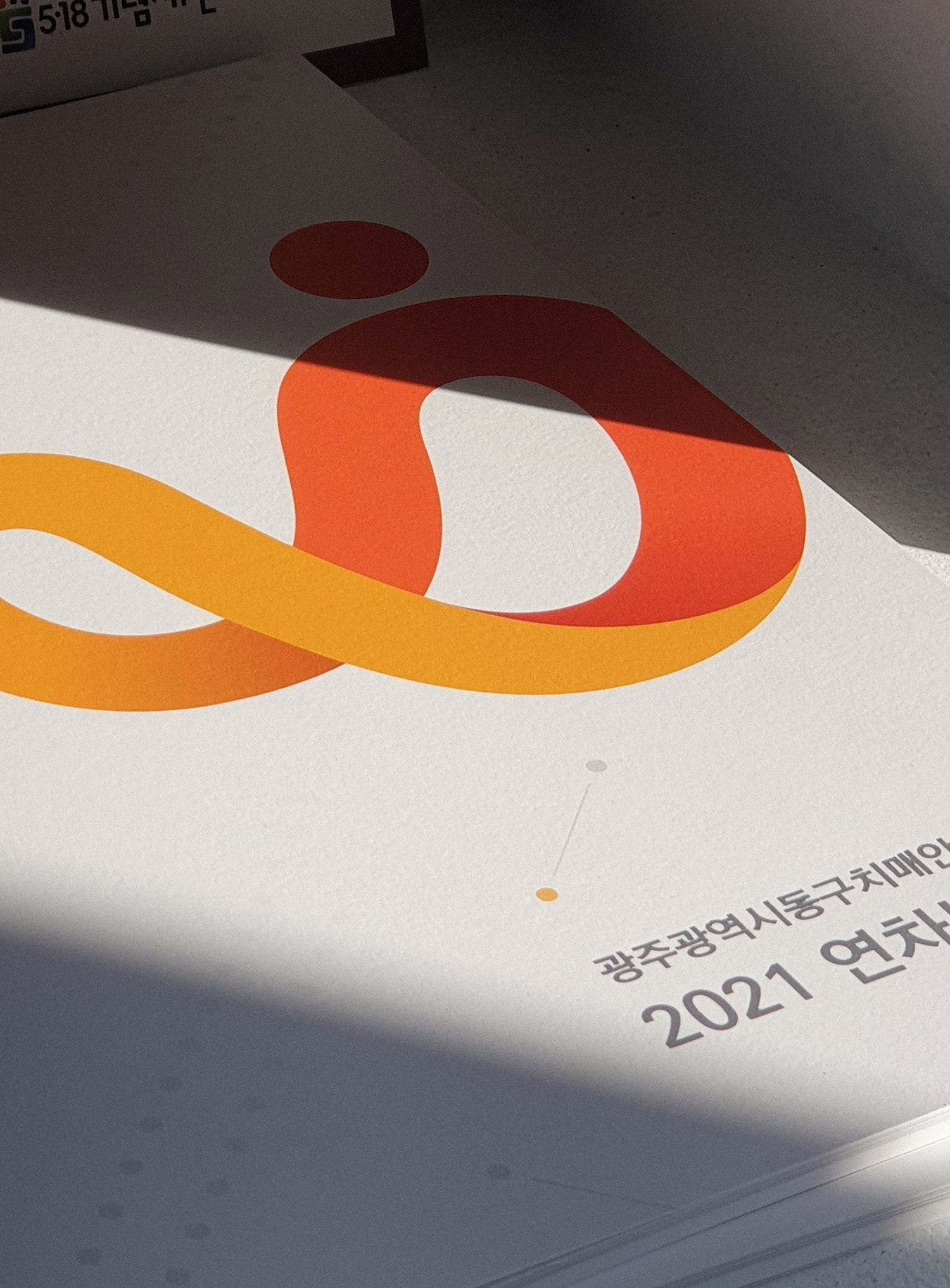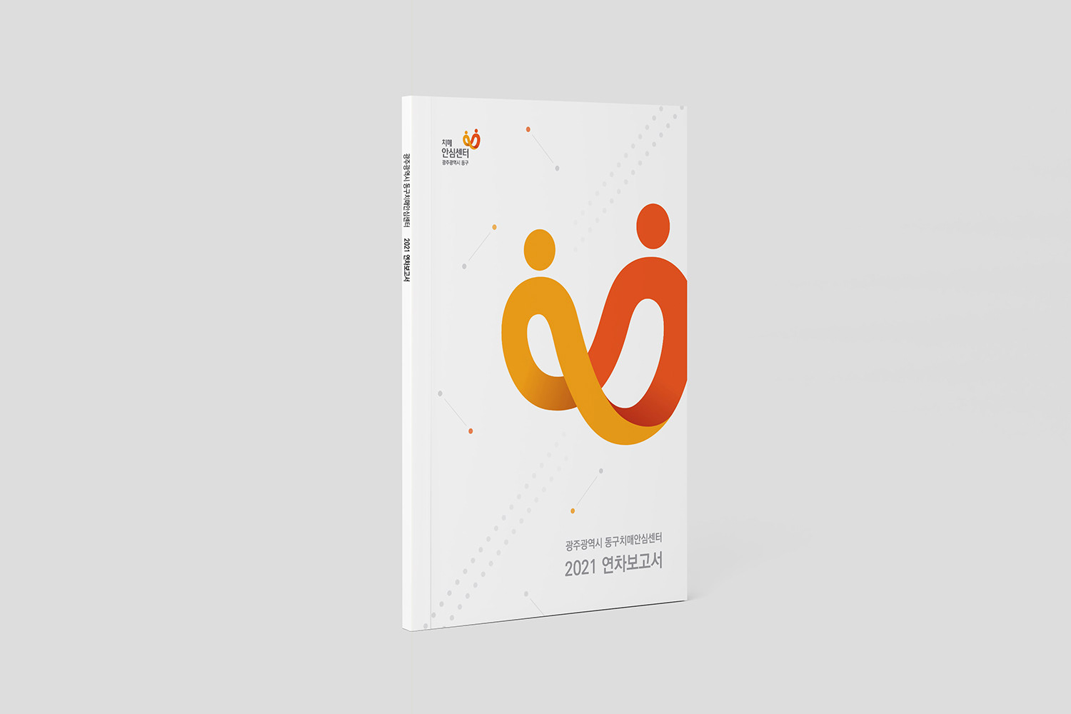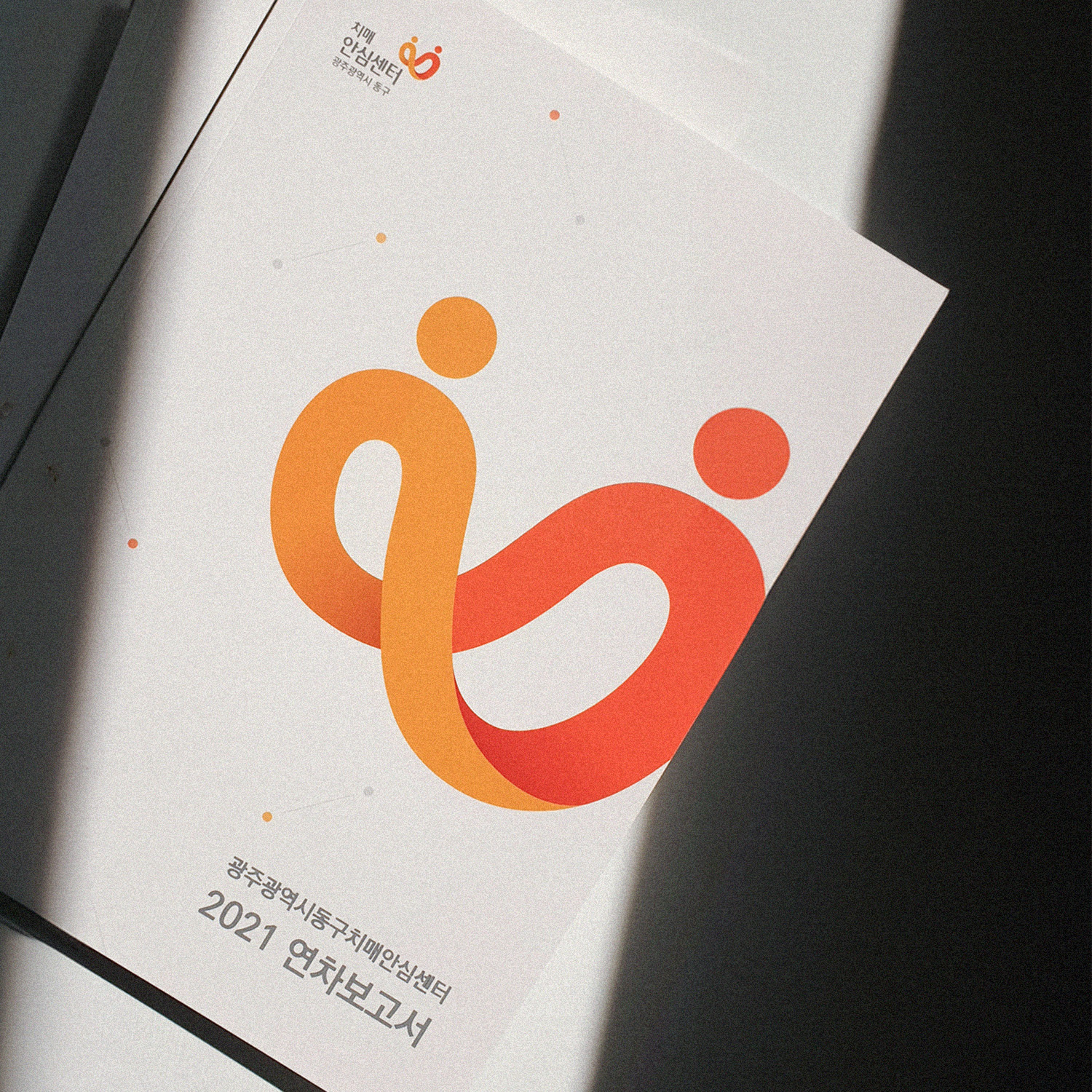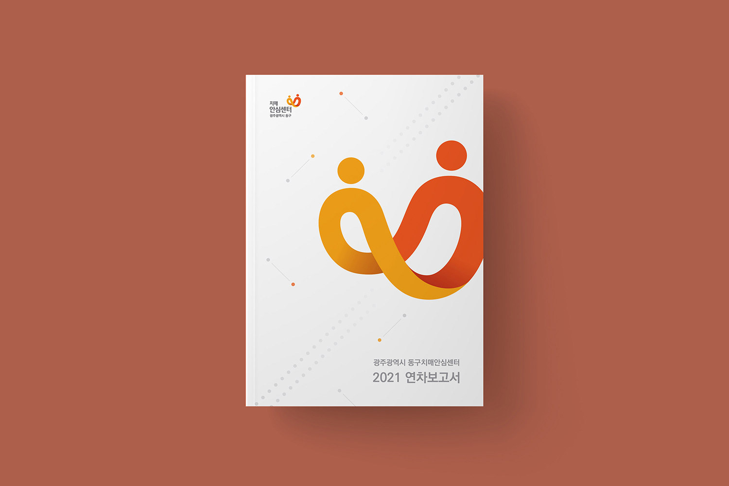 지역사회 치매예방 및 관리의 중심 역할을 수행하는 광주동구치매안심센터의 활동을 기록한 2021 연차보고서입니다. 로고 모티프인 무한대(∞)와 '사람'의 형상을 유기적인 곡선으로 확장하여, 케어와 연결의 의미를 따뜻한 오렌지 그라데이션으로 표현했습니다. 자칫 딱딱할 수 있는 보건 기관의 보고서를 부드럽고 친근한 그래픽 언어로 풀어내어 정보 전달력과 정서적 유대감을 동시에 높였습니다.