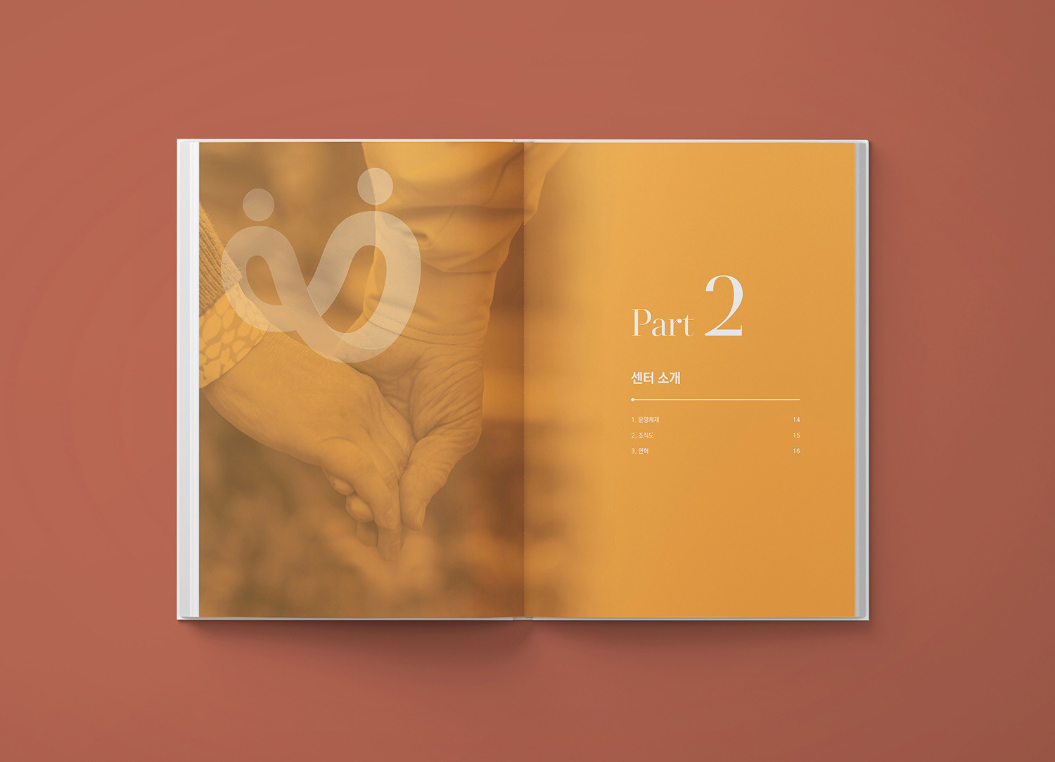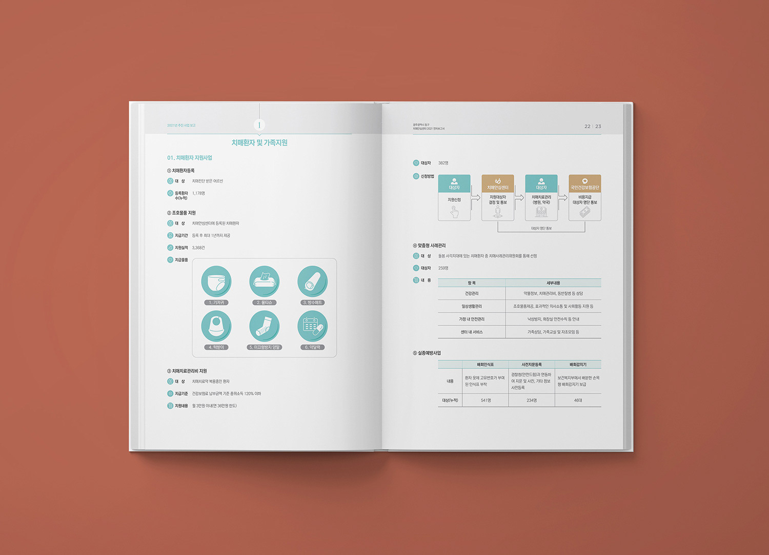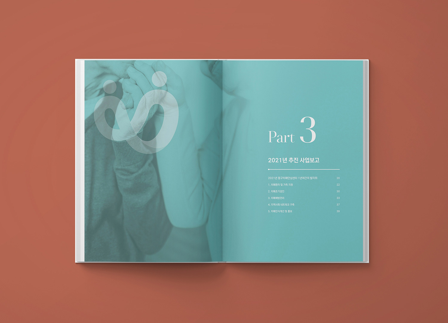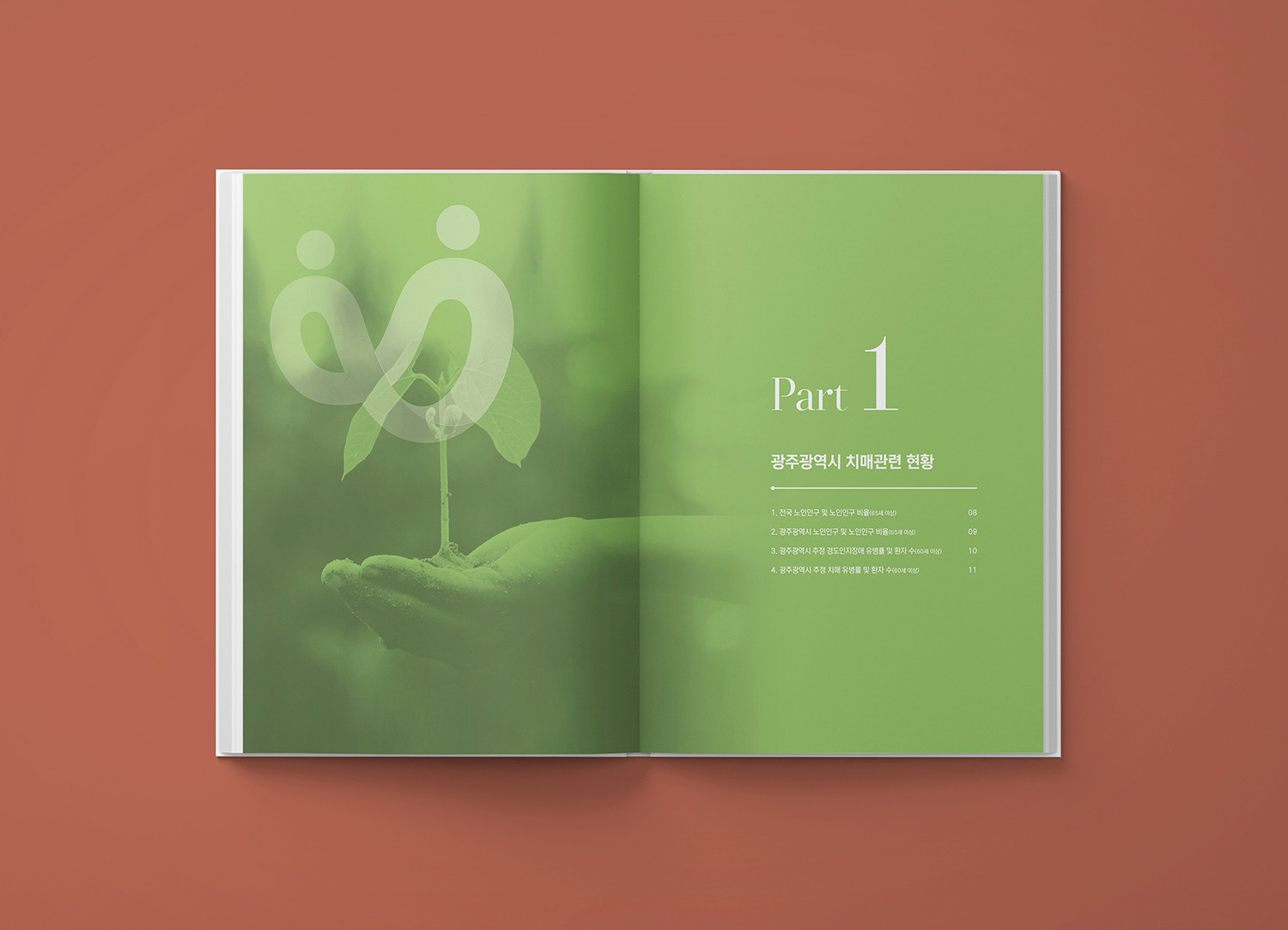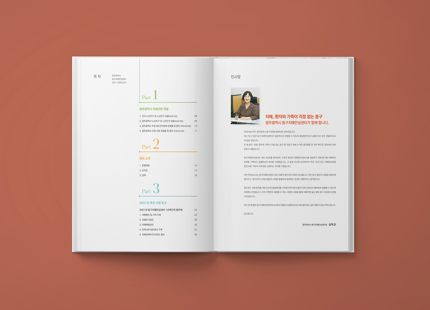 지역사회 치매예방 및 관리의 중심 역할을 수행하는 광주동구치매안심센터의 활동을 기록한 2021 연차보고서입니다. 로고 모티프인 무한대(∞)와 '사람'의 형상을 유기적인 곡선으로 확장하여, 케어와 연결의 의미를 따뜻한 오렌지 그라데이션으로 표현했습니다. 자칫 딱딱할 수 있는 보건 기관의 보고서를 부드럽고 친근한 그래픽 언어로 풀어내어 정보 전달력과 정서적 유대감을 동시에 높였습니다.
