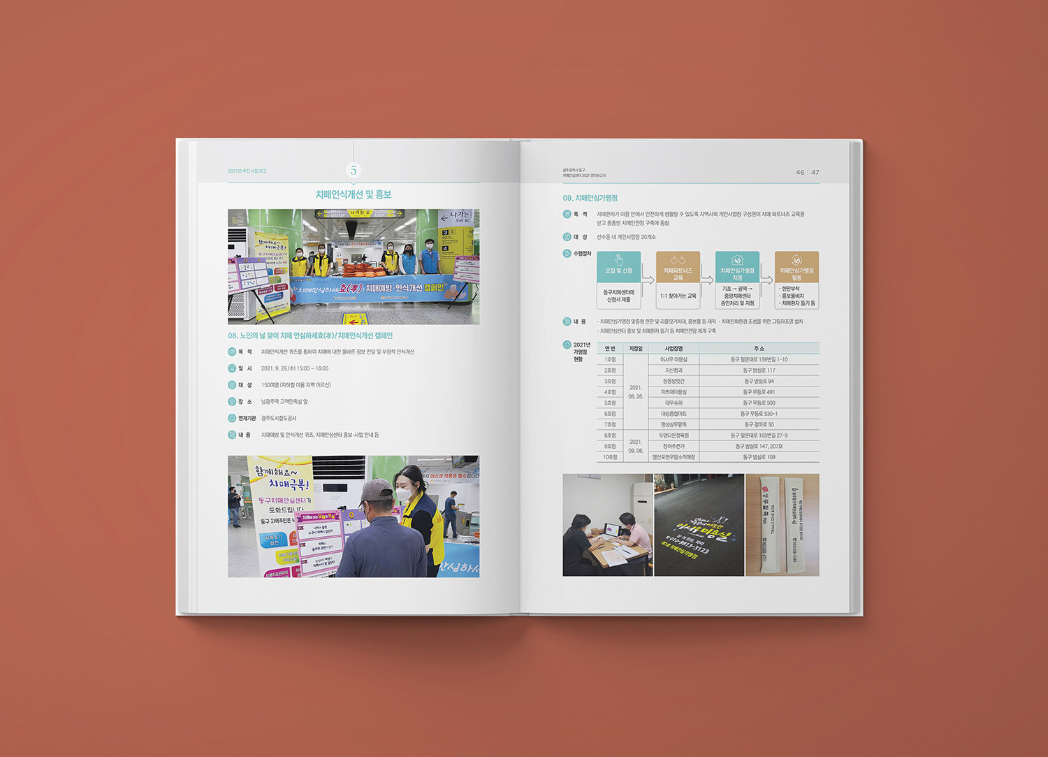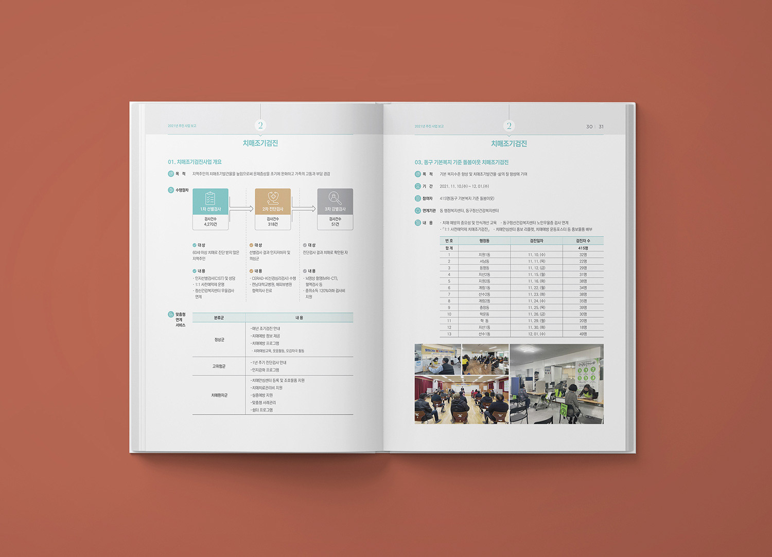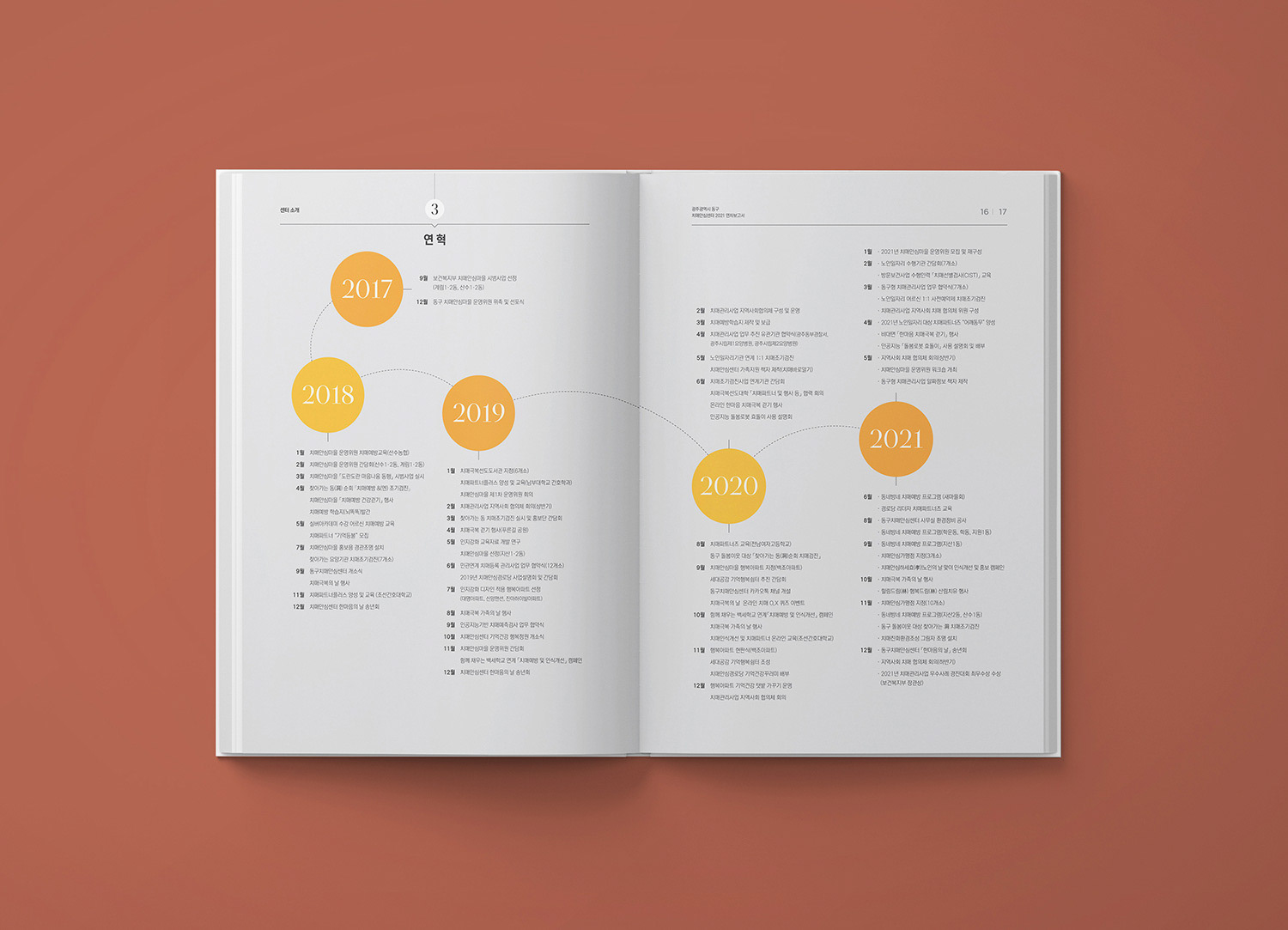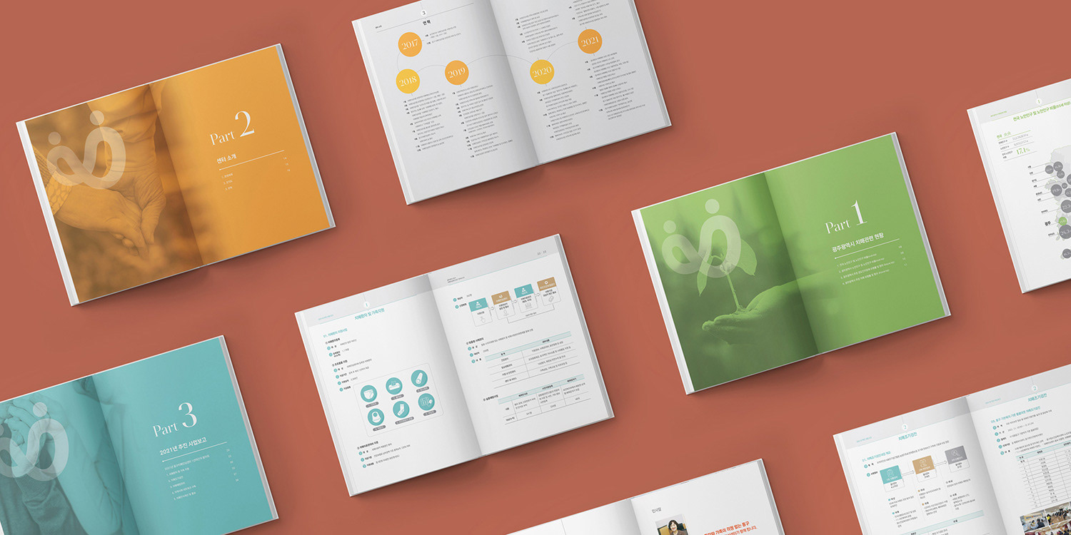 지역사회 치매예방 및 관리의 중심 역할을 수행하는 광주동구치매안심센터의 활동을 기록한 2021 연차보고서입니다. 로고 모티프인 무한대(∞)와 '사람'의 형상을 유기적인 곡선으로 확장하여, 케어와 연결의 의미를 따뜻한 오렌지 그라데이션으로 표현했습니다. 자칫 딱딱할 수 있는 보건 기관의 보고서를 부드럽고 친근한 그래픽 언어로 풀어내어 정보 전달력과 정서적 유대감을 동시에 높였습니다.