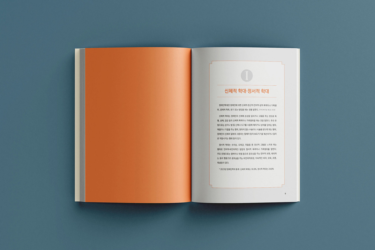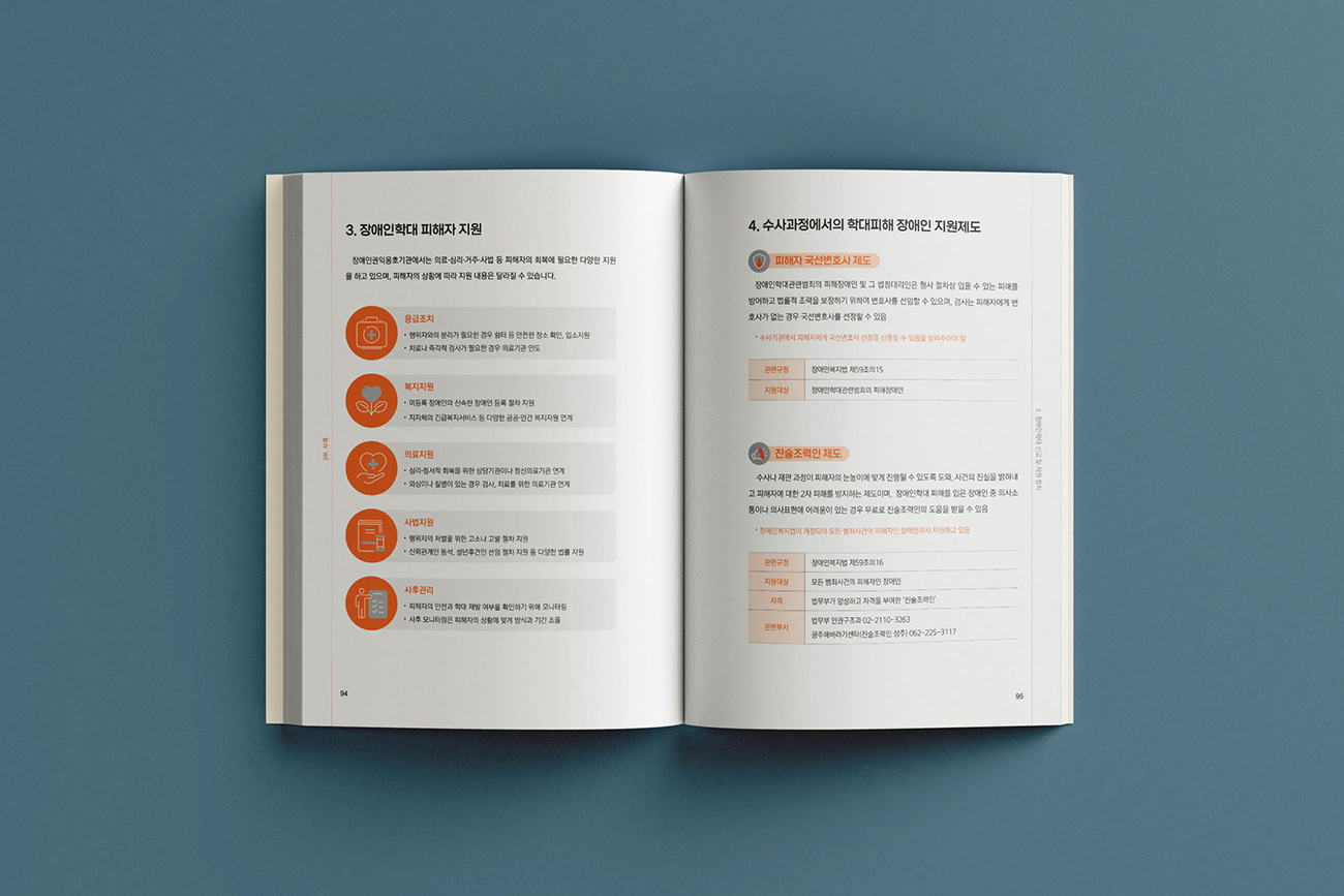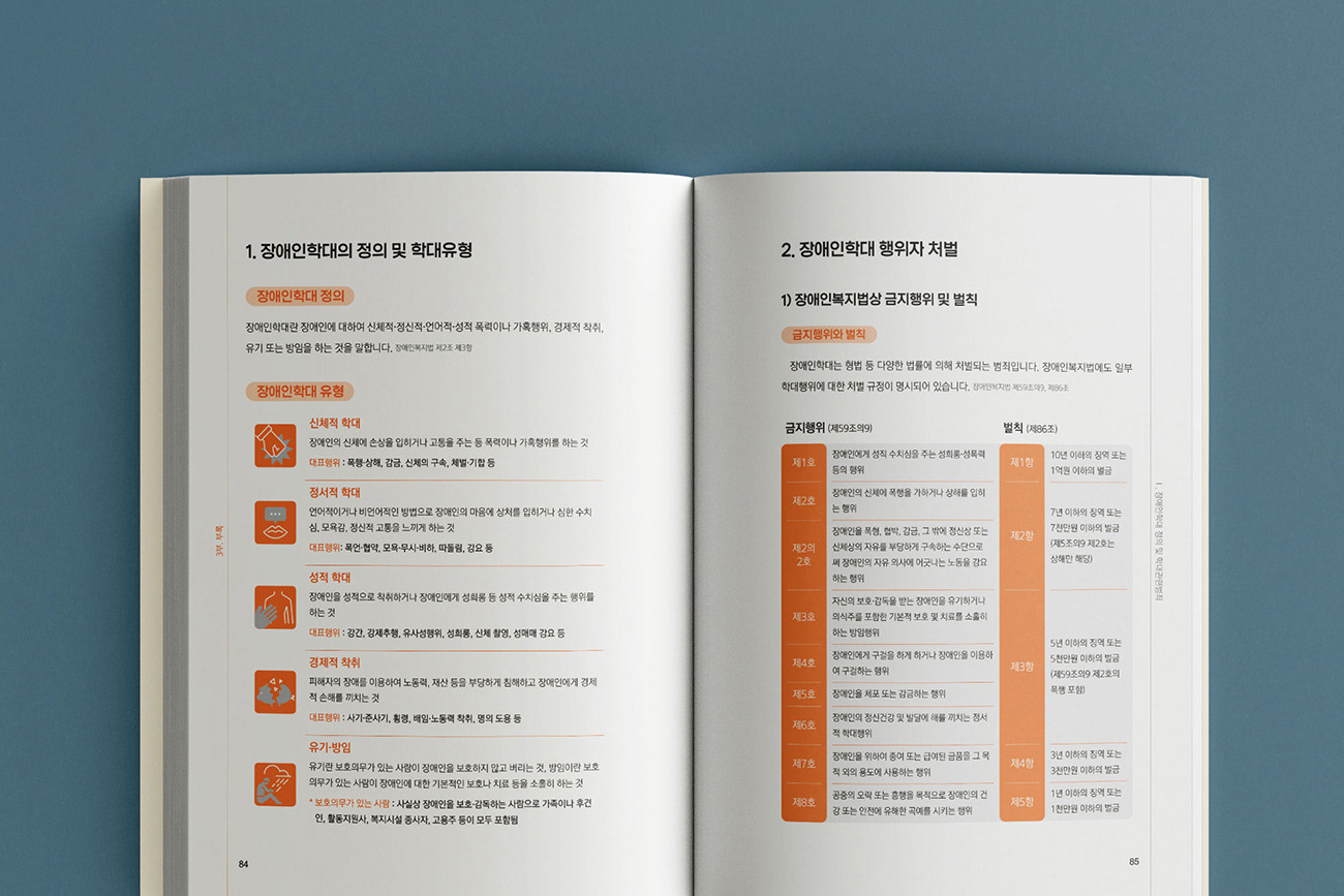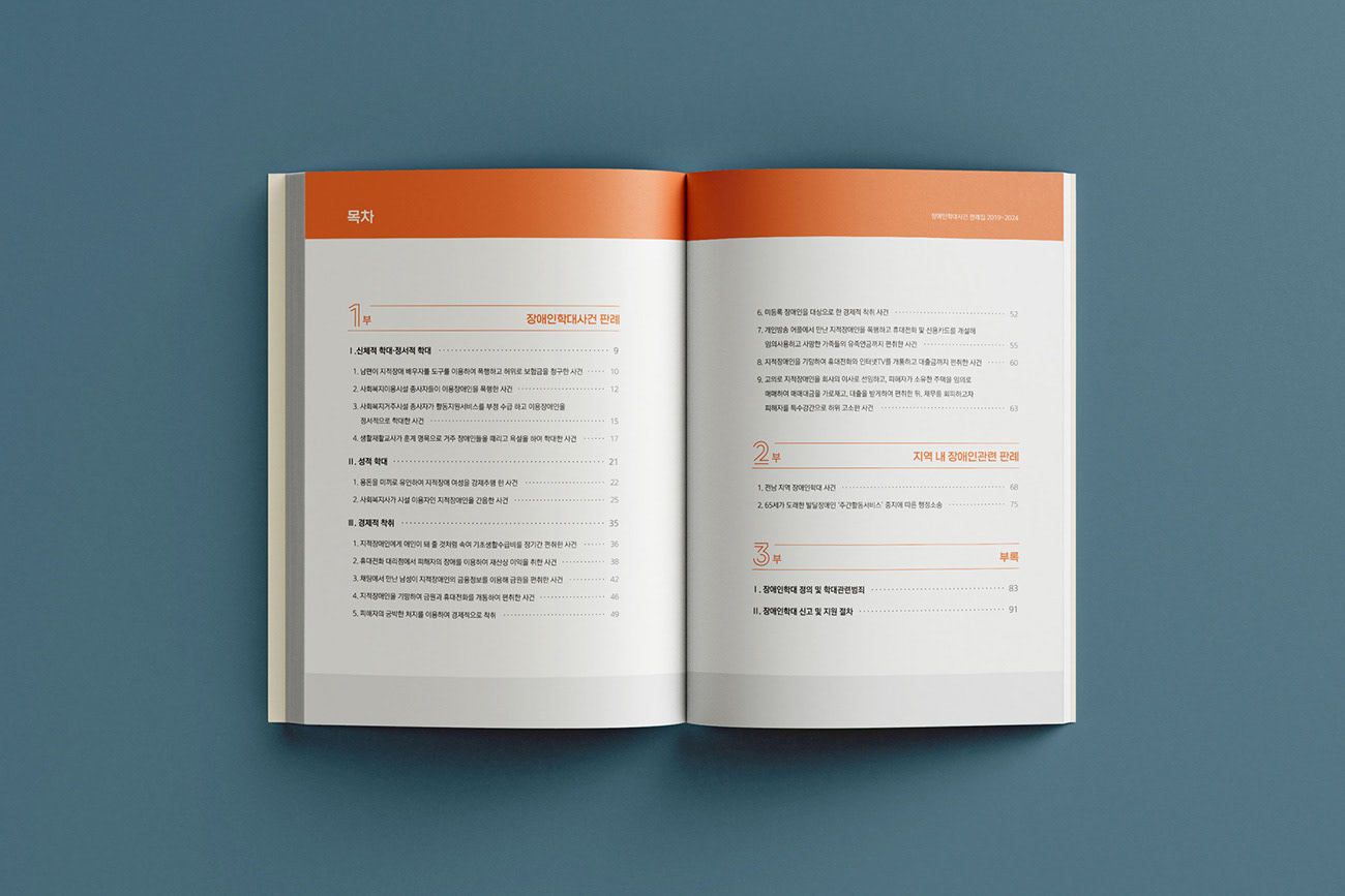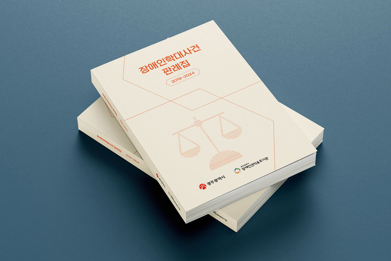 광주광역시 장애인권익옹호기관의 지난 5년간의 법률적 대응 성과를 기록한 <장애인 학대 사건 판례집(2019-2024)>을 제작하였습니다. 디자인줌은 정의와 평등의 상징인 천칭(Scale) 모티프를 정제된 라인 그래픽으로 재해석하여 시각적 질서를 부여하였습니다. 복잡한 법률 사례를 체계적으로 시각화하여 정보의 가독성을 높이고, 공공기관의 사회적 신뢰를 확보하는데 주력하였습니다.