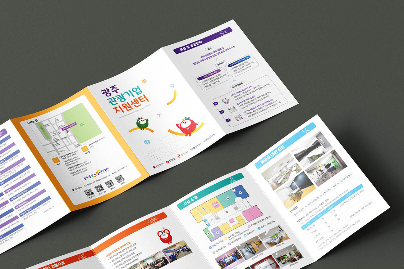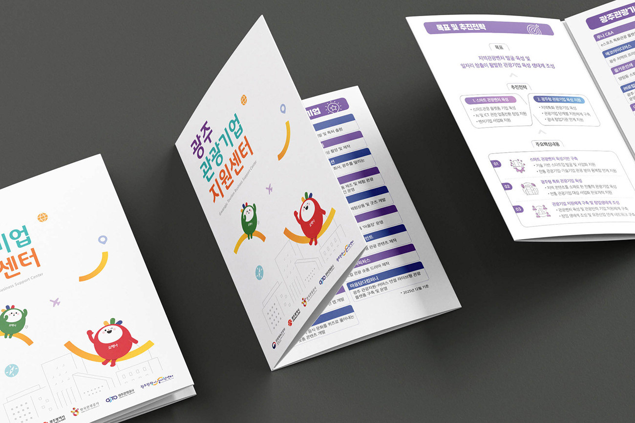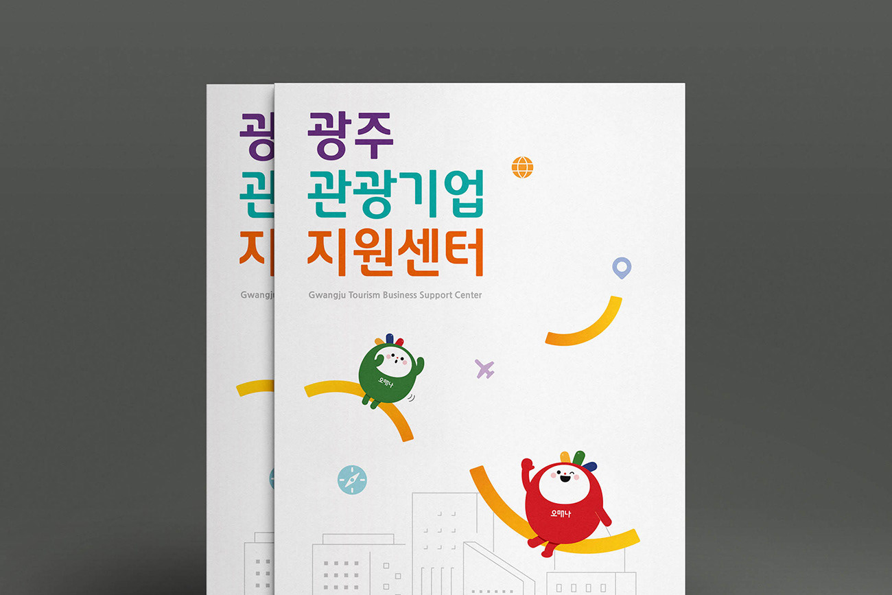 광주광역시 관광 산업의 거점이자 관광콘텐츠 스타트업 육성의 산실인 광주관광기업지원센터의 홍보물 디자인입니다. 디자인줌은 광주의 관광 캐릭터 '오매나'와 유기적인 그래픽 모티프를 결합하여 센터가 지향하는 역동적인 에너지와 지역 관광의 활기찬 내일을 시각화하였습니다. 다채로운 컬러요소와 정제된 레이아웃을 통해 공공기관의 신뢰성을 유지하면서도, 혁신성과 친근함을 동시에 전달하는 데 주력하였습니다.